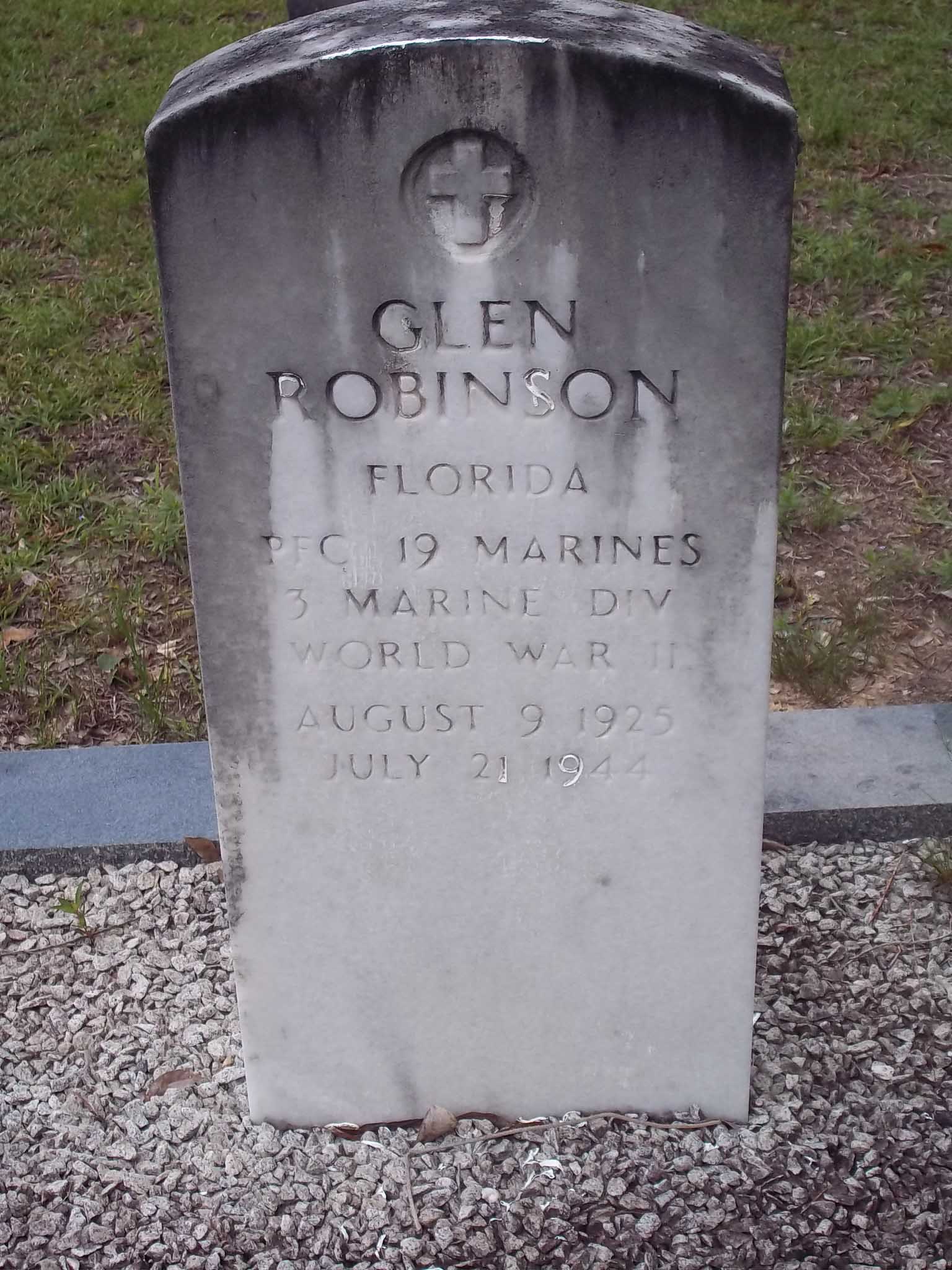 Glen Robinson was born on August 9, 1925. He was the husband of Voncile (DeShazo) Robinson. He served in Company F, 2nd Battalion, 19th Marine Regiment, 3rd Marine Division as a Private First Class during World War II. He was Killed in Action on July 21, 1944, during the Battle for Guam.