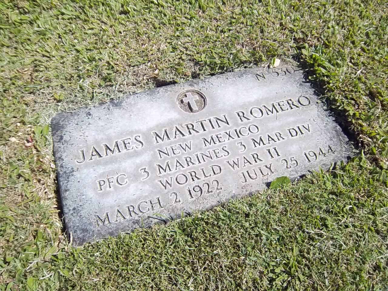 James Martin Romero was born on March 2, 1922. He served in Company G, 2nd Battalion, 3rd Marine Regiment, 3rd Marine Division as a Private First Class during World War II. He was Killed in Action on July 25, 1944, during the Battle for Guam.