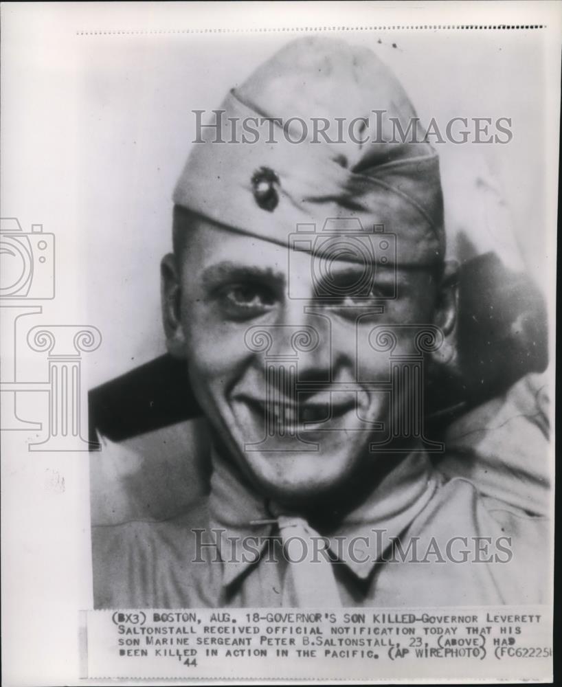 The President of the United States of America takes pride in presenting the Silver Star (Posthumously) to Platoon Sergeant Peter B. Saltonstall (MCSN: 378338), United States Marine Corps, for conspicuous gallantry and intrepidity as a member of a six-man reconnaissance patrol serving with the First 155-mm. Howitzer Battalion, Third Amphibious Corps, Fleet Marine Force, in action against enemy Japanese forces on Guam, Marianas Islands, 13 August 1944. When three men of his patrol, including his superior officer, were separated from the rest by a group of Japanese, Platoon Sergeant Saltonstall immediately assumed command of the remainder of the unit and opened fire on the enemy. Joined by another small patrol and deciding to attempt a break-through to aid the forward group, he courageously led his men toward the vicinity of the Japanese and, as the enemy suddenly ambushed them with hand grenades, repeatedly warned his comrades of those grenades he was able to see, meanwhile steadfastly maintaining accurate, effective fire. Subsequently, unaware that three of his group were wounded, he arose to give the order to close in, but was killed by enemy rifle fire. Platoon Sergeant Saltonstall's inspiring leadership, dauntless fighting spirit and unselfish efforts on behalf of his comrades were in keeping with the highest traditions of the United States Naval Service. He gallantly gave his life for his county.