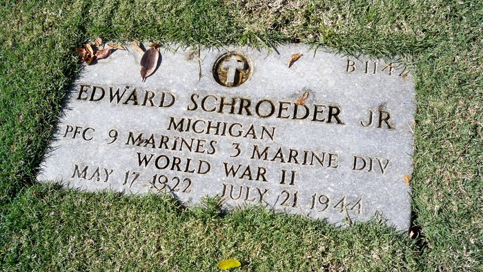 Edward Schroeder Jr. was born on May 17, 1922. He served in Company G, 2nd Battalion, 9th Marine Regiment, 3rd Marine Division as a Private First Class during World War II. He was Killed in Action on July 21, 1944, during the Battle for Guam.