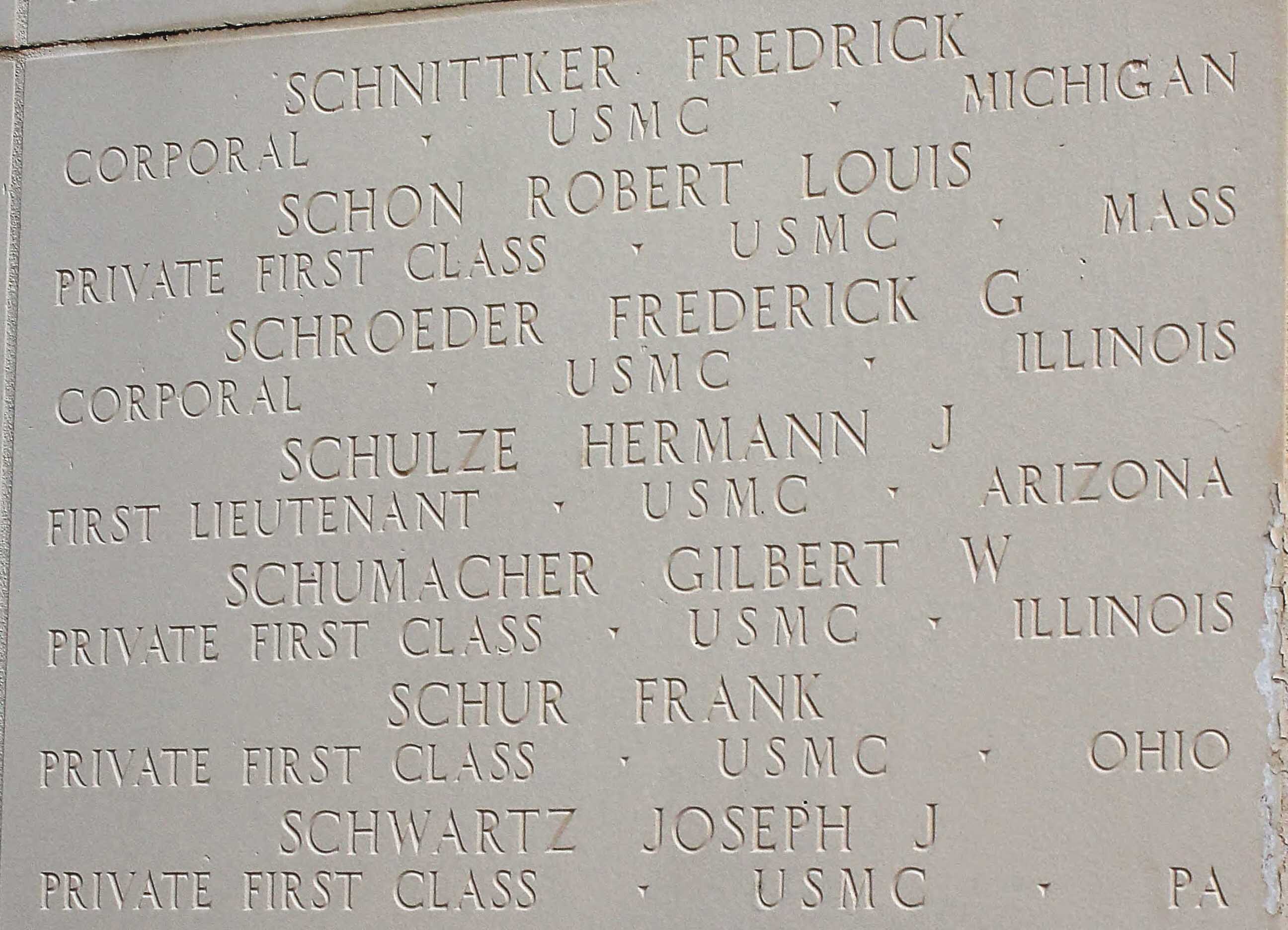 Joseph Jacob Schwartz served in Company G, 2nd Battalion, 22nd Marine Regiment, 1st Provisional Marine Brigade as a Private First Class during World War II. He died from his wounds received in battle on July 27, 1944, during the Battle for Guam. He was buried at sea.
