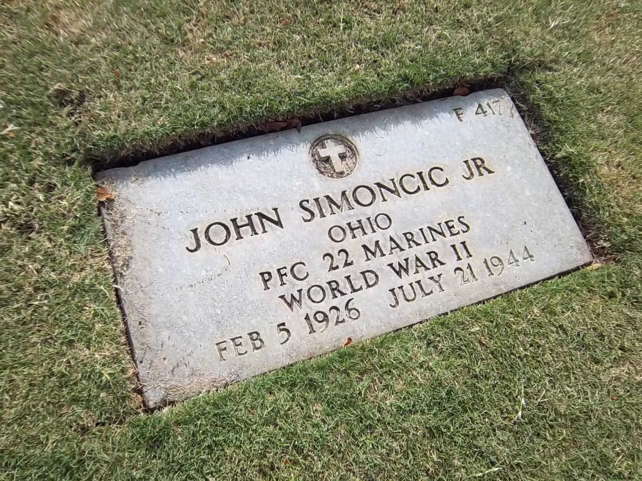 John Simoncic Jr. was born on February 5, 1926. He served in Company C, 1st Battalion, 22nd Marine Regiment, 1st Provisional Marine Brigade as a Private First Class during World War II. He was Killed in Action on July 21, 1944, during the Battle for Guam.