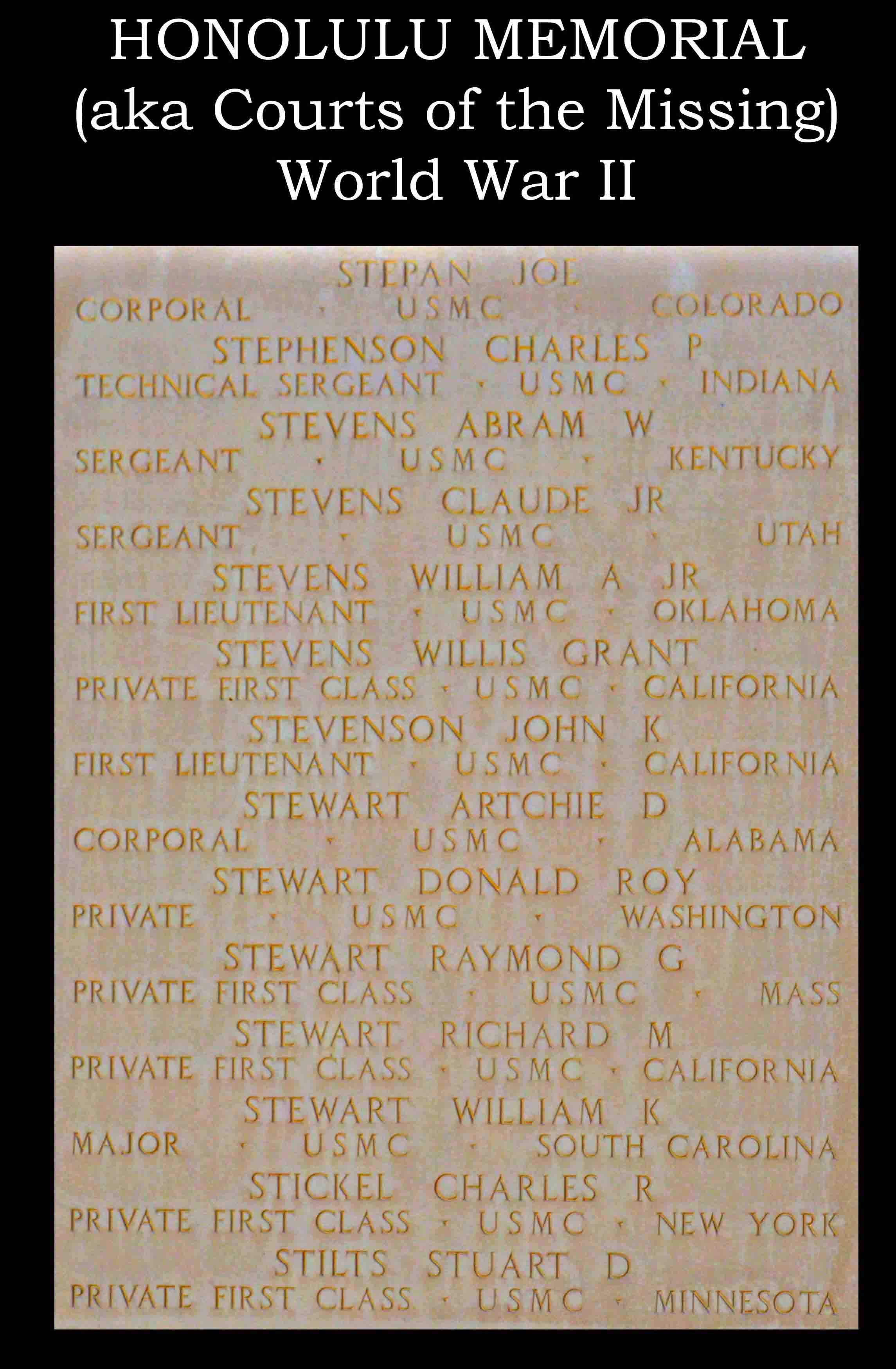 Joe Stepan was born on November 5, 1917, in Pueblo, Pueblo County, Colorado. He served in the Military Police and Prisoners of War Detachment Headquarters, United States Marine Corps as a Corporal during World War II. He was declared Missing in Action on July 22, 1945, during the Battle for Guam.