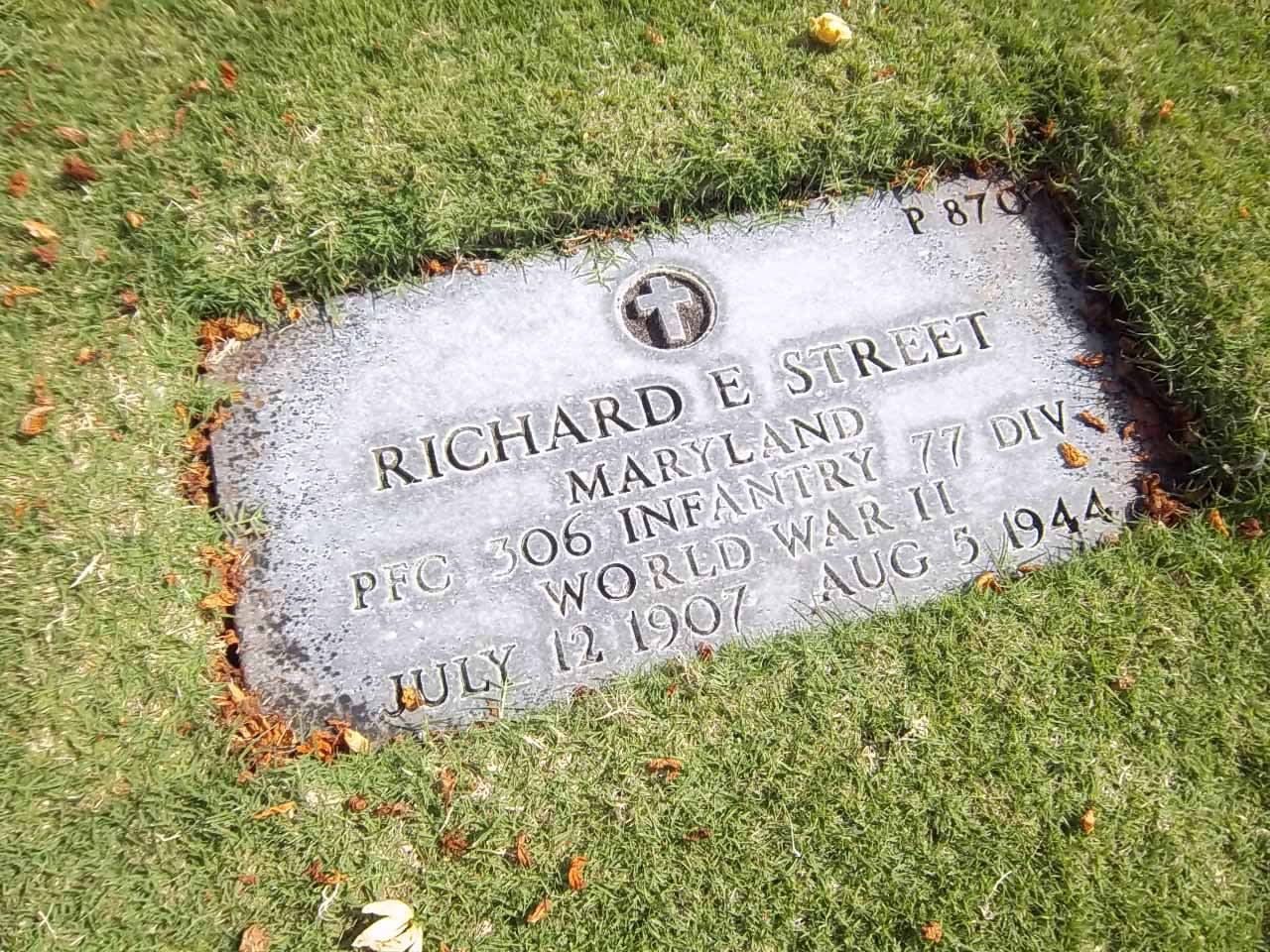 Richard E. Street was born on July 12, 1907, in Maryland. He served in the 306th Infantry Regiment, 77th Infantry Division as a Private First Class during World War II. He was Killed in Action on August 5, 1944, during the Battle for Guam.