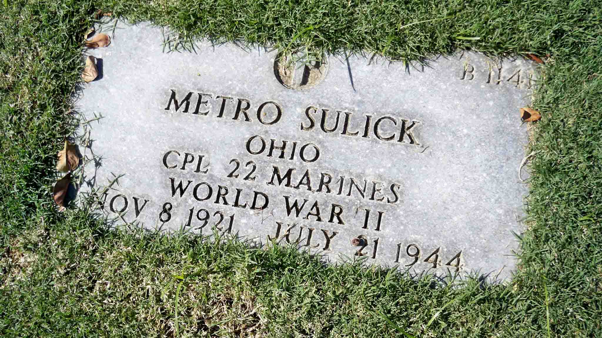 Metro Sulick was born on November 8, 1921. He served in the Headquarters Company, 1st Battalion, 22nd Marine Regiment, 1st Provisional Marine Brigade as a Corporal during World War II. He died from his wounds received in battle on July 21, 1944, during the Battle for Guam.