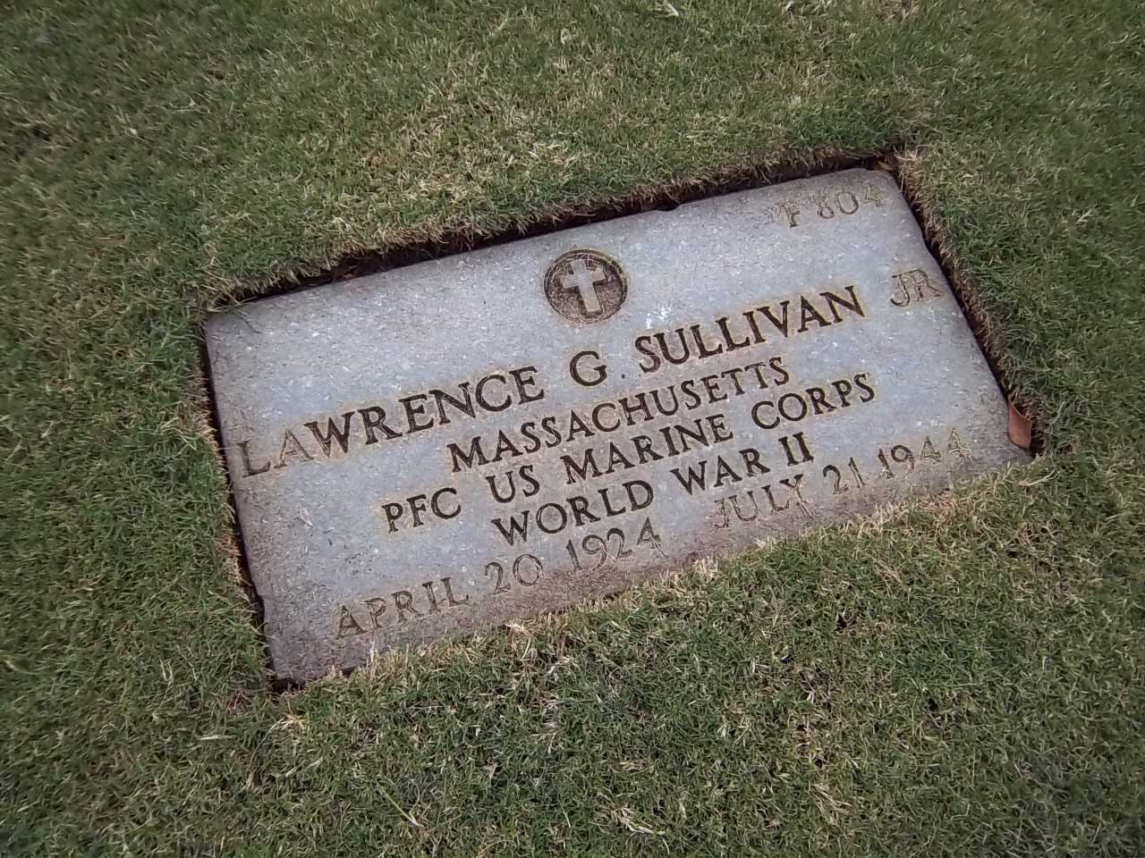 Lawrence Golden Sullivan Jr. was born on April 20, 1924. He served in Company G, 2nd Battalion, 22nd Marine Regiment, 1st Provisional Marine Brigade as a Private First Class during World War II. He was Killed in Action on July 21, 1944, during the Battle for Guam.