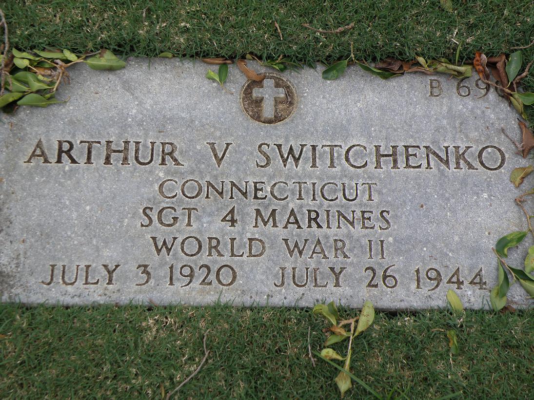 Arthur Victor Switchenko was born on July 3, 1920. He served in Company A, 1st Battalion, 4th Marine Regiment, 1st Provisional Marine Brigade as a Sergeant during World War II. He was Killed in Action on July 26, 1944, during the Battle for Guam.