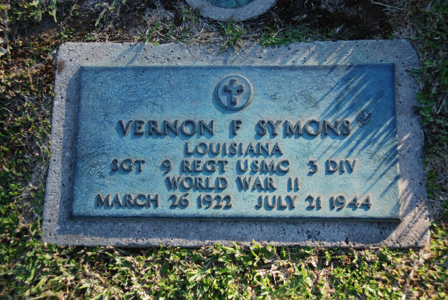 Vernon Francis Symons was born on March 26, 1922. He served in the Weapons Company, 9th Marine Regiment, 3rd Marine Division as a Sergeant during World War II. He was Killed in Action on July 21, 1944, during the Battle for Guam.