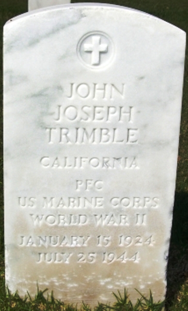 John Joseph Trimble was born on January 15, 1924. He served in the Headquarters Company, 2nd Battalion, 9th Marine Regiment, 3rd Marine Division as a Private First Class during World War II. He was Killed in Action on July 25, 1944, during the Battle for Guam.