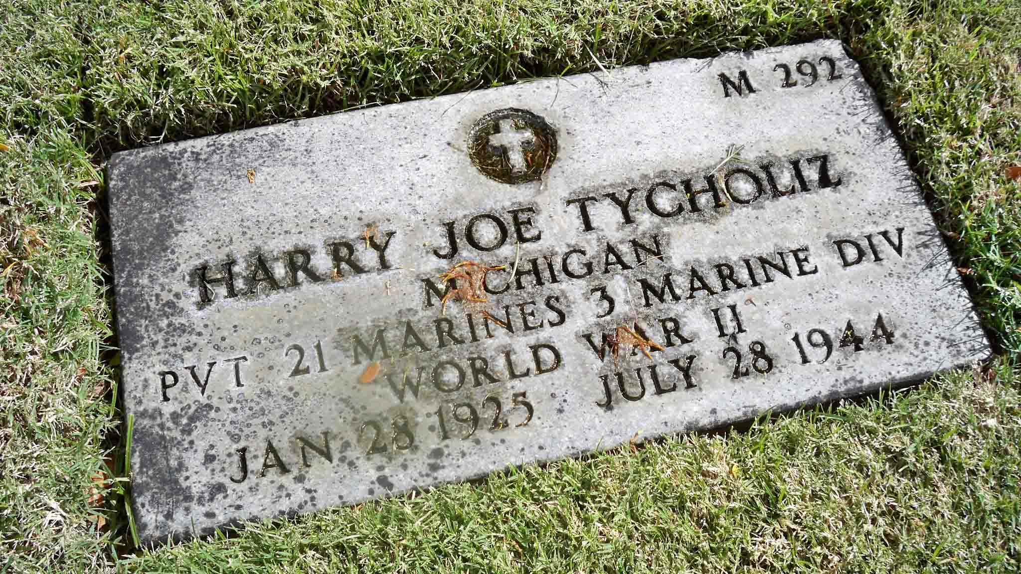 Harry Joe Tycholiz was born on January 28, 1925. He served in Company K, 3rd Battalion, 21st Marine Regiment, 3rd Marine Division as a Private during World War II. He died from his wounds received in battle on July 28, 1944, during the Battle for Guam.