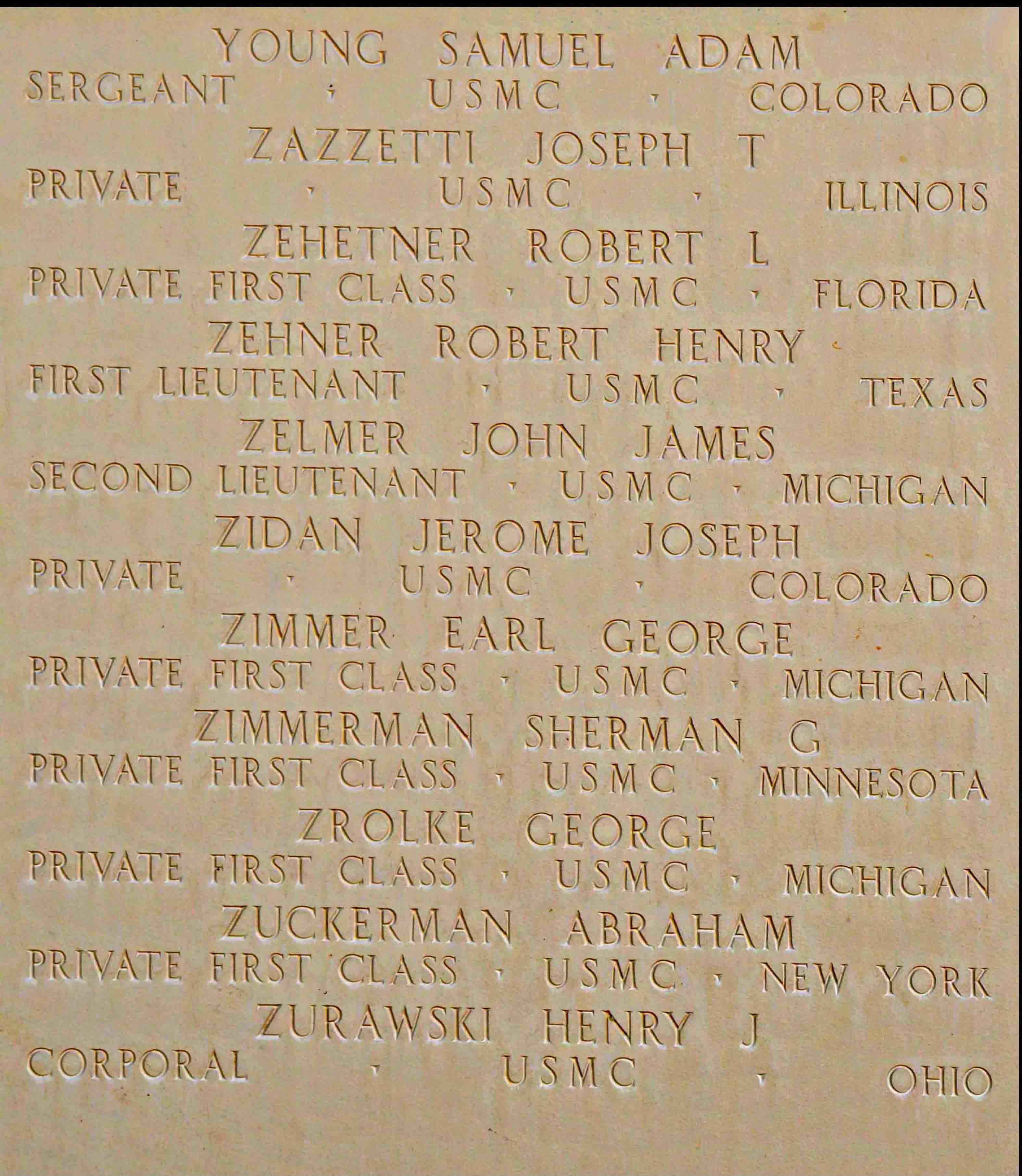 Jerome Joseph Zidan was born on March 16, 1915, in Denver City and County of Denver, Colorado. He served in Battery E, 2nd Battalion, 12th Marine Regiment, 3rd Marine Division as a Private during World War II. He was Killed in Action on July 22, 1944, during the Battle for Guam. He was buried at sea.