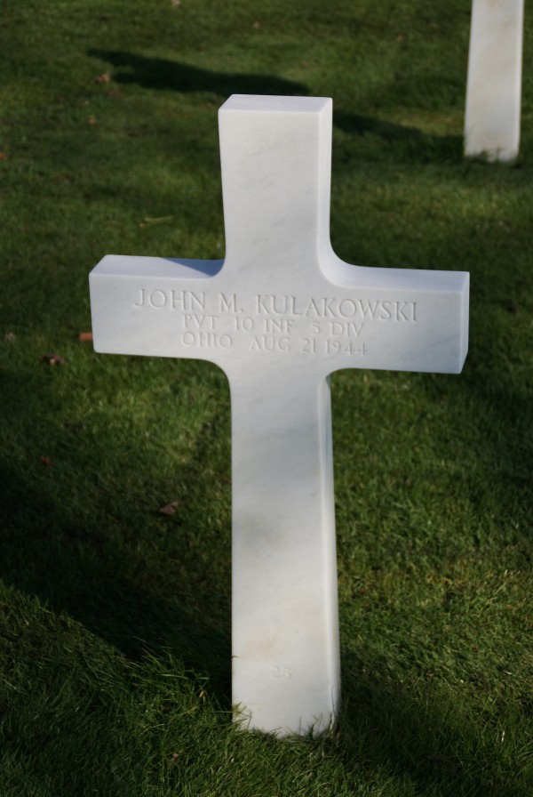 John M. Kulakowski was born on June 26, 1920, in Cleveland, Cuyahoga, Ohio. He enlisted on April 13, 1939, in Raleigh, North Carolina. John served in the 10th Infantry Regiment, 5th Infantry Division, as a Private during World War II. Pvt Kulakowski was Killed in Action on August 21, 1944, during the liberation of Malesherbes in France. He was buried at Brittany American Cemetery and Memorial, Saint-James, Departement de la Manche, Basse-Normandie, France, and was awarded the Purple Heart.