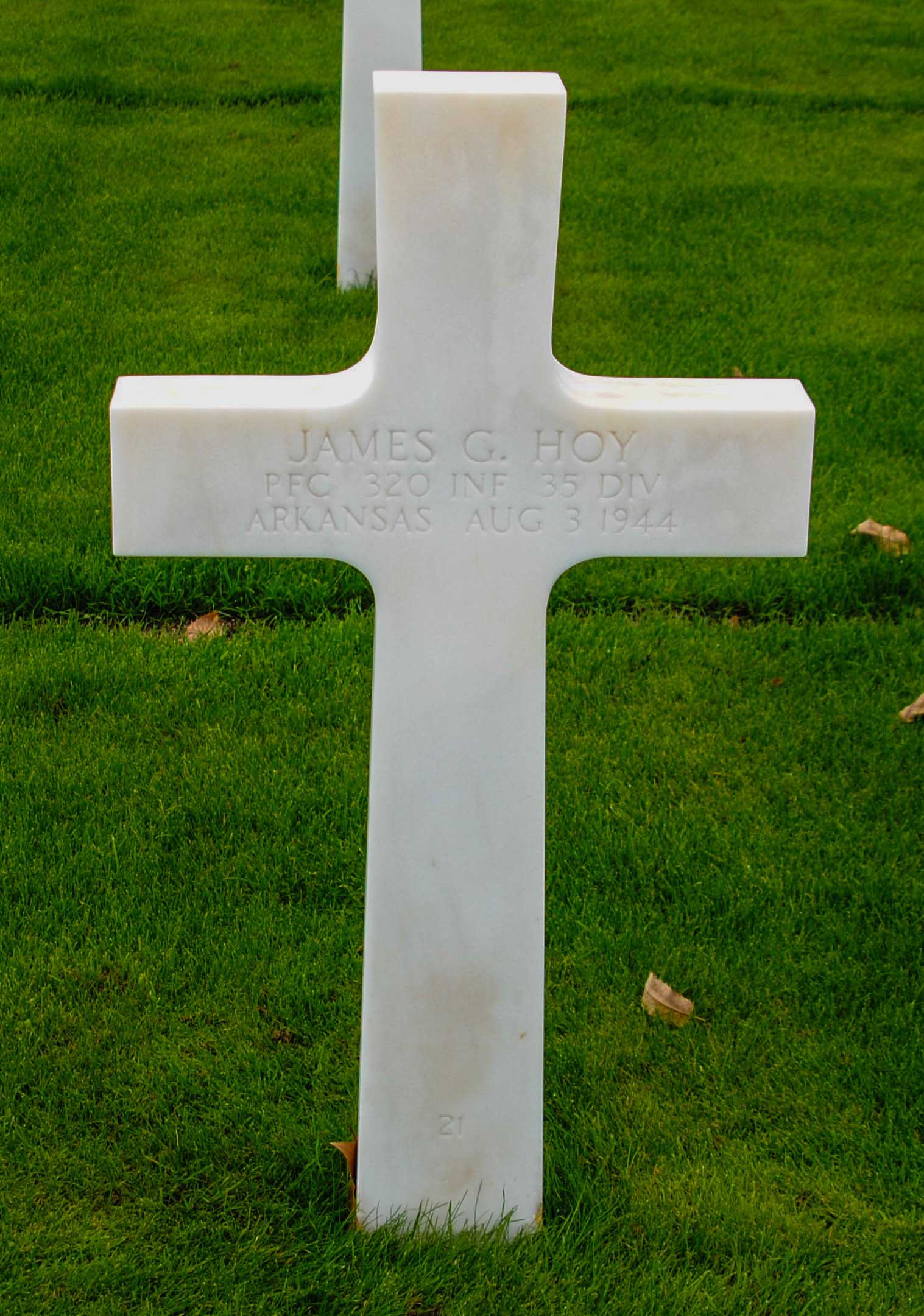 James served in the 320th Infantry Regiment, 35th Infantry Division, as a Private First Class during World War II. He died from his wounds received in battle on August 3, 1944, during the liberation of Pont Farcy in France. PFC Hoy is now buried in the Brittany American Cemetery and Memorial, Saint-James, Departement de la Manche, Basse-Normandie, France. He also has a memorial marker at the Pine Hill Cemetery, Jonesboro, Craighead County, Arkansas, USA. He was awarded the Purple Heart.