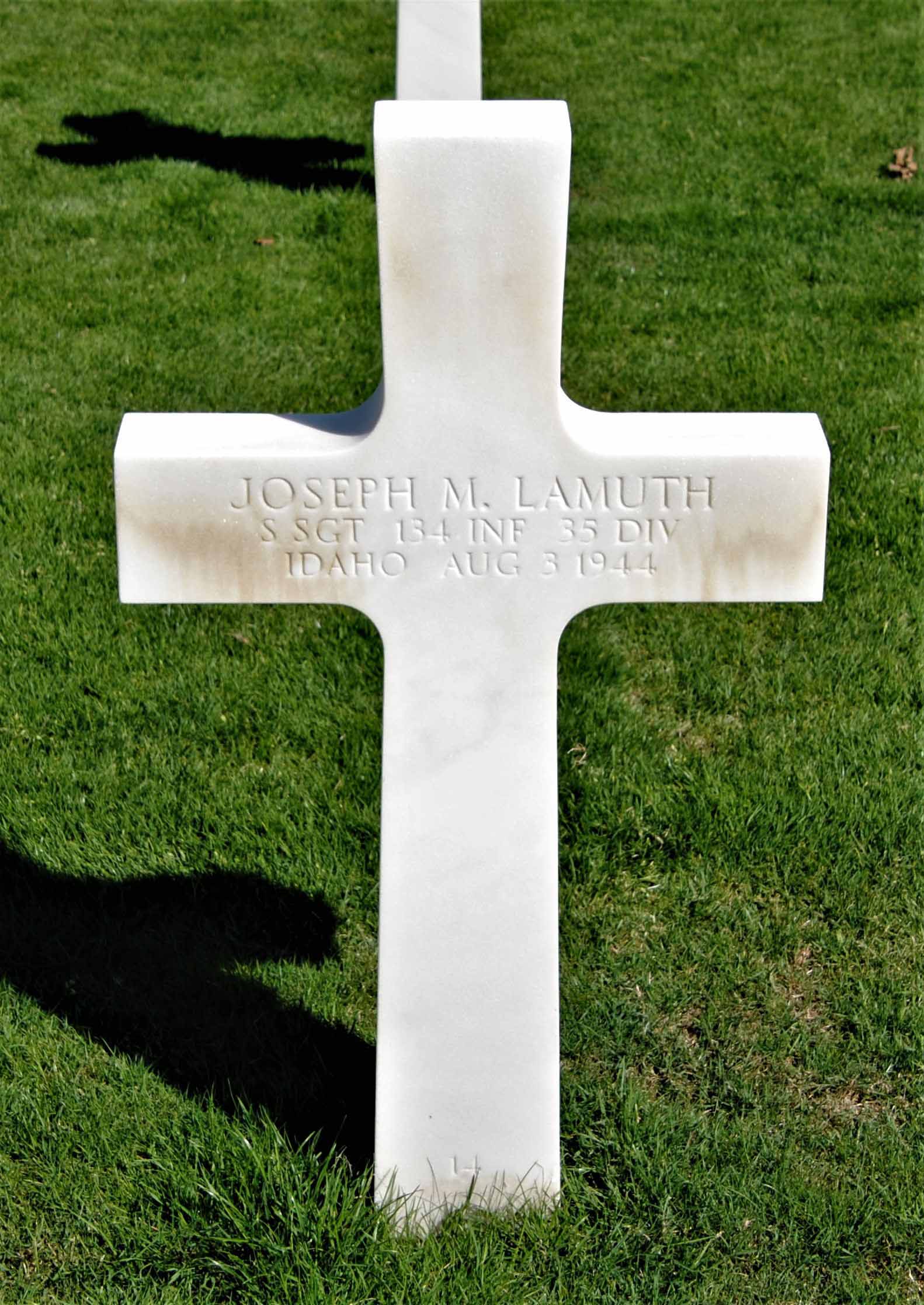 Joseph served in the 134th Infantry Regiment, 35th Infantry Division, as a Staff Sergeant during World War II. He was Killed in Action on August 3, 1944, during the liberation of Pont Farcy in France. SSgt Lamuth is now buried in the Normandy American Cemetery and Memorial, Colleville-sur-Mer, Departement du Calvados, Basse-Normandie, France. He was awarded the Purple Heart with Oak Leaf Cluster.