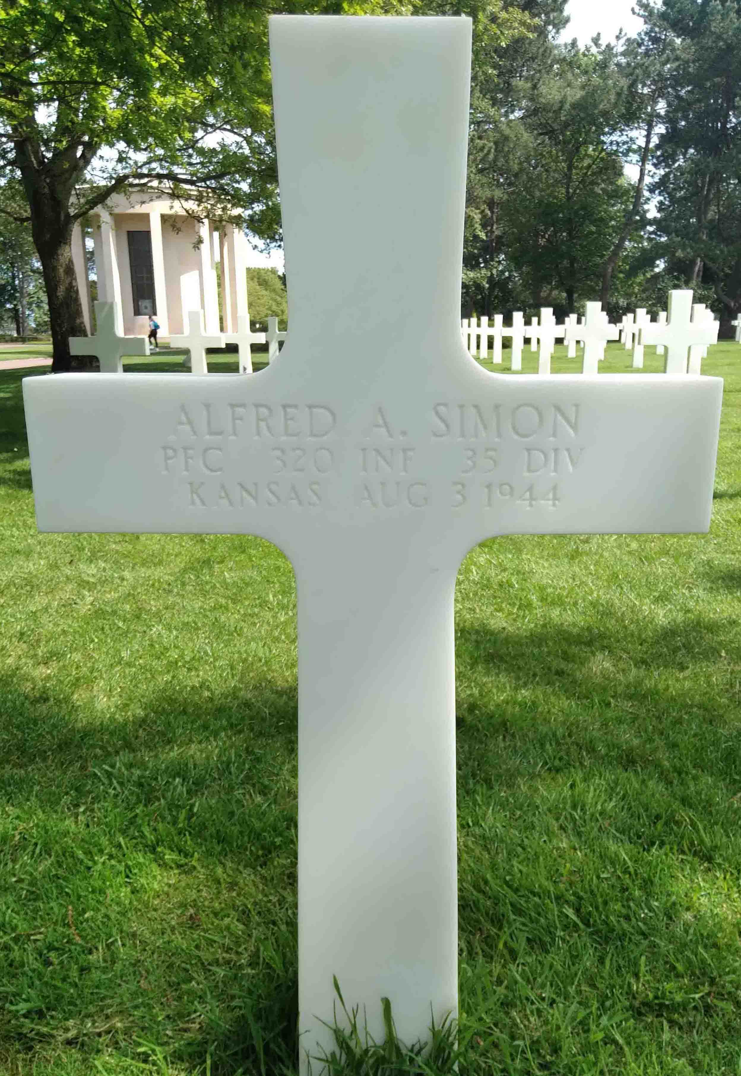 Alfred Aloysious Simon was born on October 21, 1916, in Kansas. Alfred served in the 320th Infantry Regiment, 35th Infantry Division, as a Private First Class during World War II. He was Killed in Action on August 3, 1944, during the liberation of Pont Farcy in France. PFC Simon is now buried in the Normandy American Cemetery and Memorial, Colleville-sur-Mer, Departement du Calvados, Basse-Normandie, France. He also has a memorial marker at the St Marks Cemetery in Saint Marks, Kansas. He was awarded the Purple Heart.