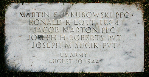 Ronald Robert Lott was born in 1919, in Illinois. He was the son of Robert Peter Lott and Katherine M Diebolt Lott. He served in the 10th Tank Battalion, 5th Armored Division, as a Technician 4th Grade during World War II. He was Killed in Action on August 10, 1944, during the liberation of Marolles, France. T4 Lott is now buried in the Zachary Taylor National Cemetery, Louisville, Jefferson County, Kentucky, USA.