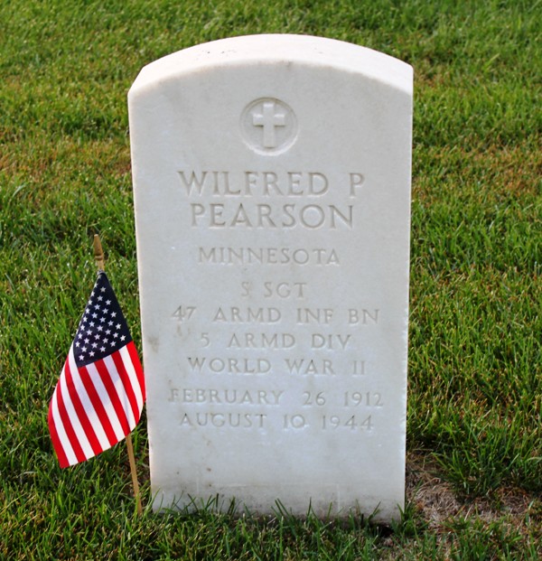 Wilfred P. Pearson was born on February 26, 1912. He served in the 47th Armored Infantry Battalion, 5th Armored Division, as a Staff Sergeant during World War II. He was Killed in Action on August 10, 1944, during the liberation of Marolles, France. SSgt Pearson is now buried in the Fort Snelling National Cemetery, Minneapolis, Hennepin County, Minnesota, USA.