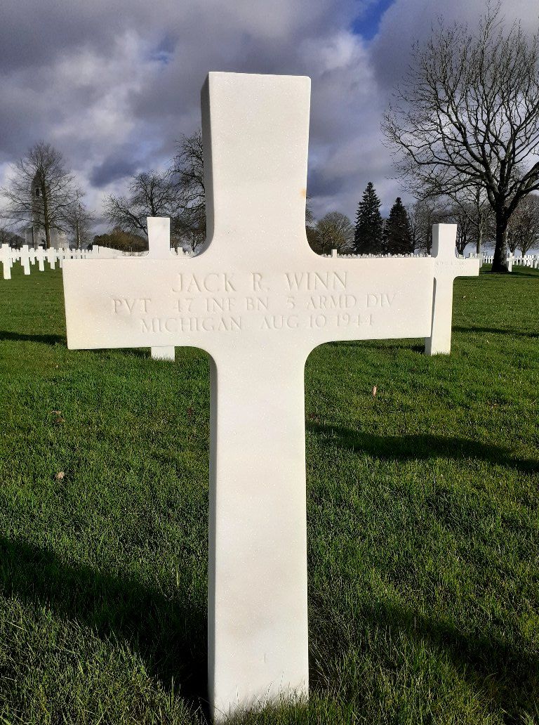 Jack Richard Winn was born on June 29, 1920, in Detroit, Wayne County, Michigan. He was the son of William Cleveland Winn and Ida Grace Winn. He served in the 47th Armored Infantry Battalion, 5th Armored Division, as a Private during World War II. He was Killed in Action on August 10, 1944, during the liberation of Marolles, France. Pvt Winn is now buried in the Brittany American Cemetery and Memorial, Saint-James, Departement de la Manche, Basse-Normandie, France.