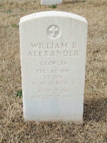William served in the 116th Infantry Regiment, 29th Infantry Division, as a Private First Class during World War II. He was Killed in Action on August 7, 1944, during the liberation of Vire, France. PFC Alexander is now buried in the Chattanooga National Cemetery, Chattanooga, Hamilton County, Tennessee, USA.