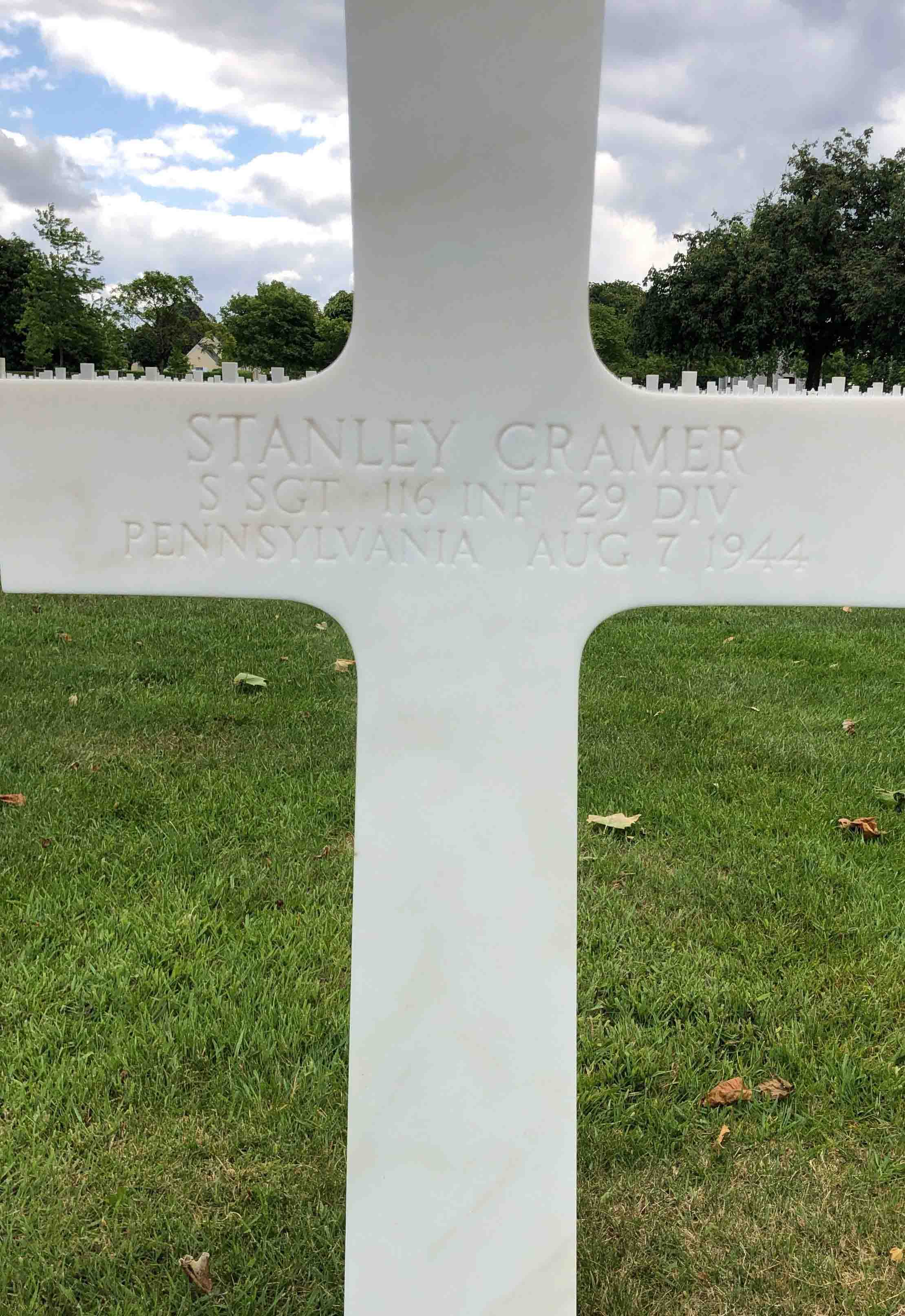 Stanley Cramer was born on February 18, 1914, in Pennsylvania. He served in the 116th Infantry Regiment, 29th Infantry Division, as a Staff Sergeant during World War II. He was Killed in Action on August 7, 1944, during the liberation of Vire, France. SSgt Cramer is now buried in the Brittany American Cemetery and Memorial, Saint-James, Departement de la Manche, Basse-Normandie, France.