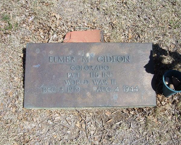 Elmer served in the 116th Infantry Regiment, 29th Infantry Division, as a Private during World War II. He was Killed in Action on August 4, 1944, during the liberation of Vire, France. Pvt Gideon is now buried in the Holly Cemetery, Holly, Prowers County, Colorado, USA.