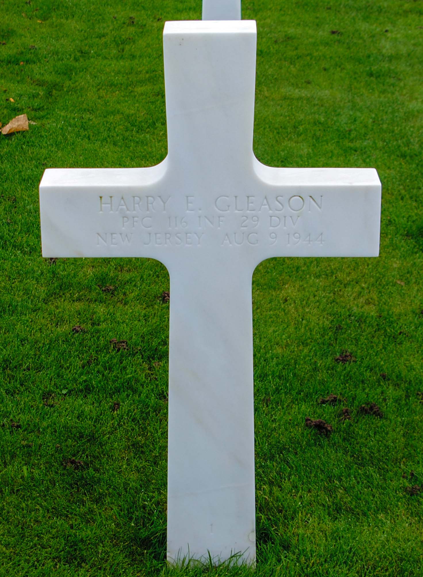 Harry served in the 116th Infantry Regiment, 29th Infantry Division, as a Private First Class during World War II. He was Killed in Action on August 9, 1944, during the liberation of Vire, France. PFC Gleason is now buried in the Brittany American Cemetery and Memorial, Saint-James, Departement de la Manche, Basse-Normandie, France.