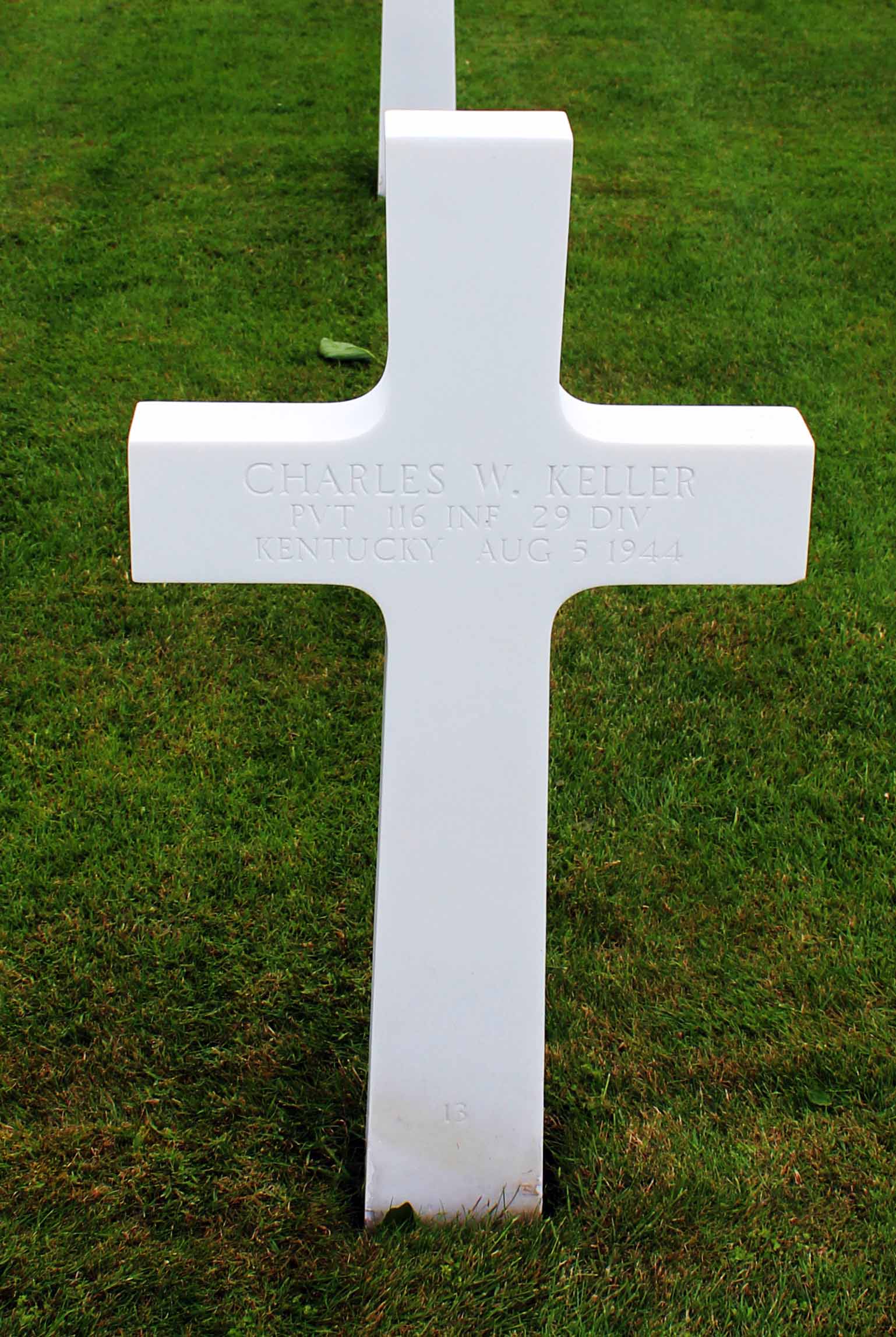 Charles served in the 116th Infantry Regiment, 29th Infantry Division, as a Private during World War II. He was Killed in Action on August 5, 1944, during the liberation of Vire, France. Pvt Keller is now buried in the Brittany American Cemetery and Memorial, Saint-James, Departement de la Manche, Basse-Normandie, France.