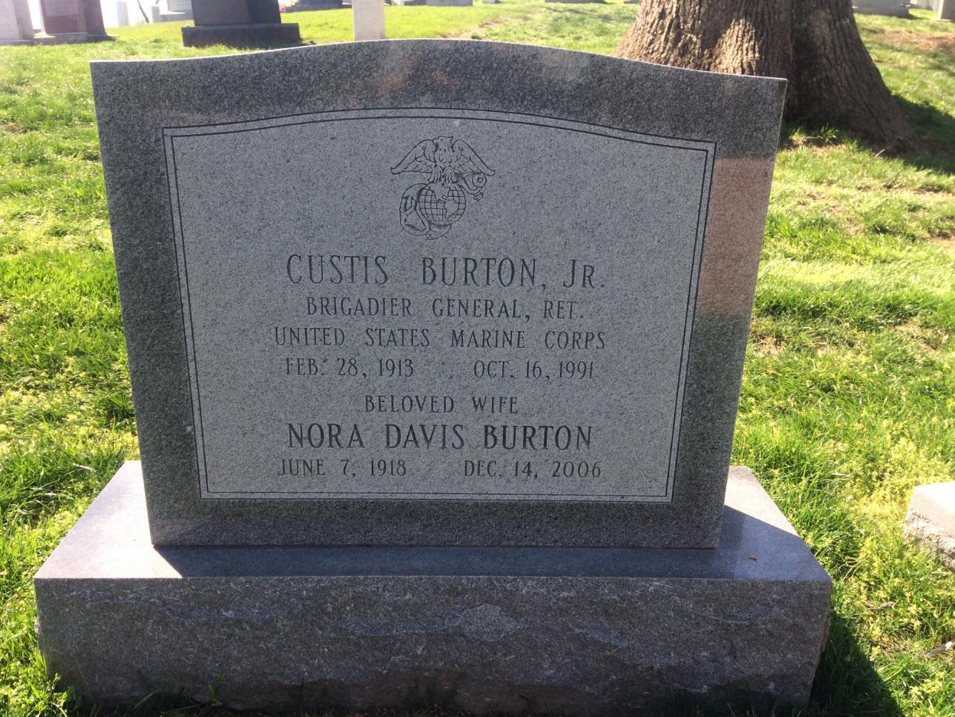Custis Burton Jr. was born on February 28, 1913, in Hopewell, Fauquier County, Virginia. He was married to Elise Nora Davis Burton. He graduated from the Virginia Military Institute and was commissioned as a 2nd Lt. in the Marine Corps in 1935. He was stationed at Pearl Harbor when the Japanese attacked on December 7, 1941, and was part of the garrison on Midway Island during the naval battle that bore its name in June 1942.