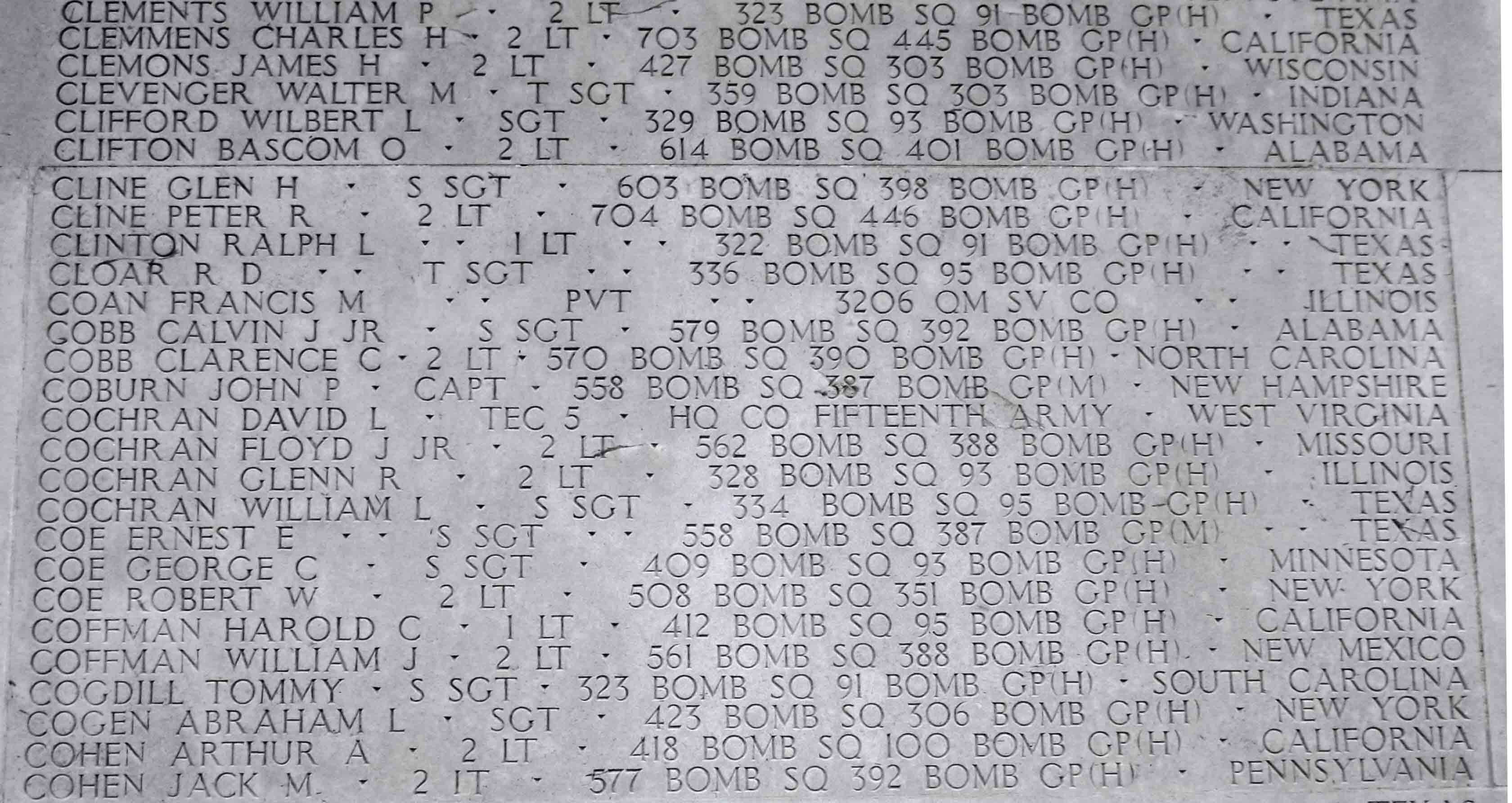 SSgt Cline was reported Missing in Action and officially declared dead on January 1, 1945. His name is memorialized in the Tablets of the Missing in the Cambridge American Cemetery and Memorial, Coton, South Cambridgeshire District, Cambridgeshire, England. Glen H. Cline's name is inscribed on the Anstey Window Memorial in Panel 3 (right), on Butterfly 24.