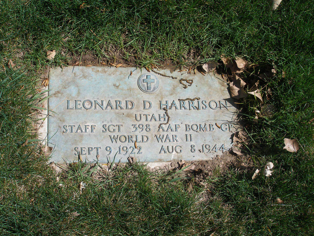 Leonard D. Harrison was born on September 9, 1922, in Salt Lake City, Salt Lake County, Utah. He was the son of Harrison Moroni Duval and Sarah E. Hansen Harrison. He entered the armed forces on December 12, 1942. He served in the 600th Bomber Squadron, 398th Bomb Group, Heavy, as a Staff Sergeant and Tail Gunner of B-17 #42-97399 during World War II.