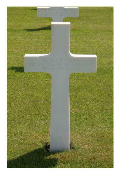 2Lt Luna was Killed in Action and is now buried in the Ardennes American Cemetery and Memorial, Neuville-en-Condroz, Arrondissement de Liège, Liège, Belgium. James E. Luna's name is inscribed on the Anstey Window Memorial in Panel 2 (center), on Butterfly 12, in the top right wing (section B).