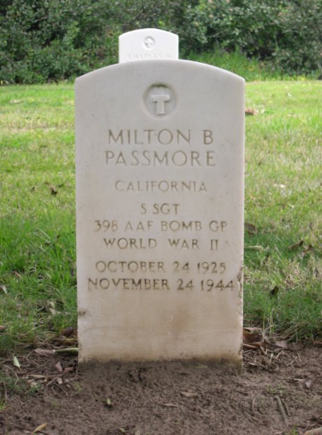 SSgt Passmore died from his wounds received in battle on November 24, 1944. He is now buried in the Fort Rosecrans National Cemetery, San Diego, San Diego County, California, USA. Milton B. Passmore's name is inscribed on the Anstey Window Memorial in Panel 3 (right), on Butterfly 22, in the bottom right wing (section D).