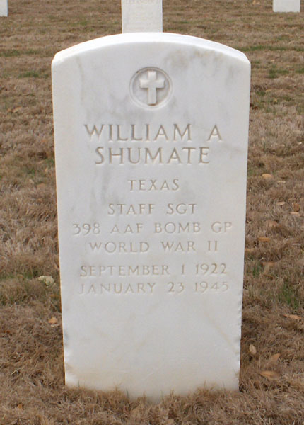 William Alton Shumate was born on September 1, 1922, in Big Wells, Dimmit County, Texas. He was the son of William Gayford Shumate and Willie Mae McCarley Shumate. He served in the 603rd Bomber Squadron, 398th Bomb Group, Heavy, as a Staff Sergeant and Waist Gunner of B-17 #44-8224 during World War II.