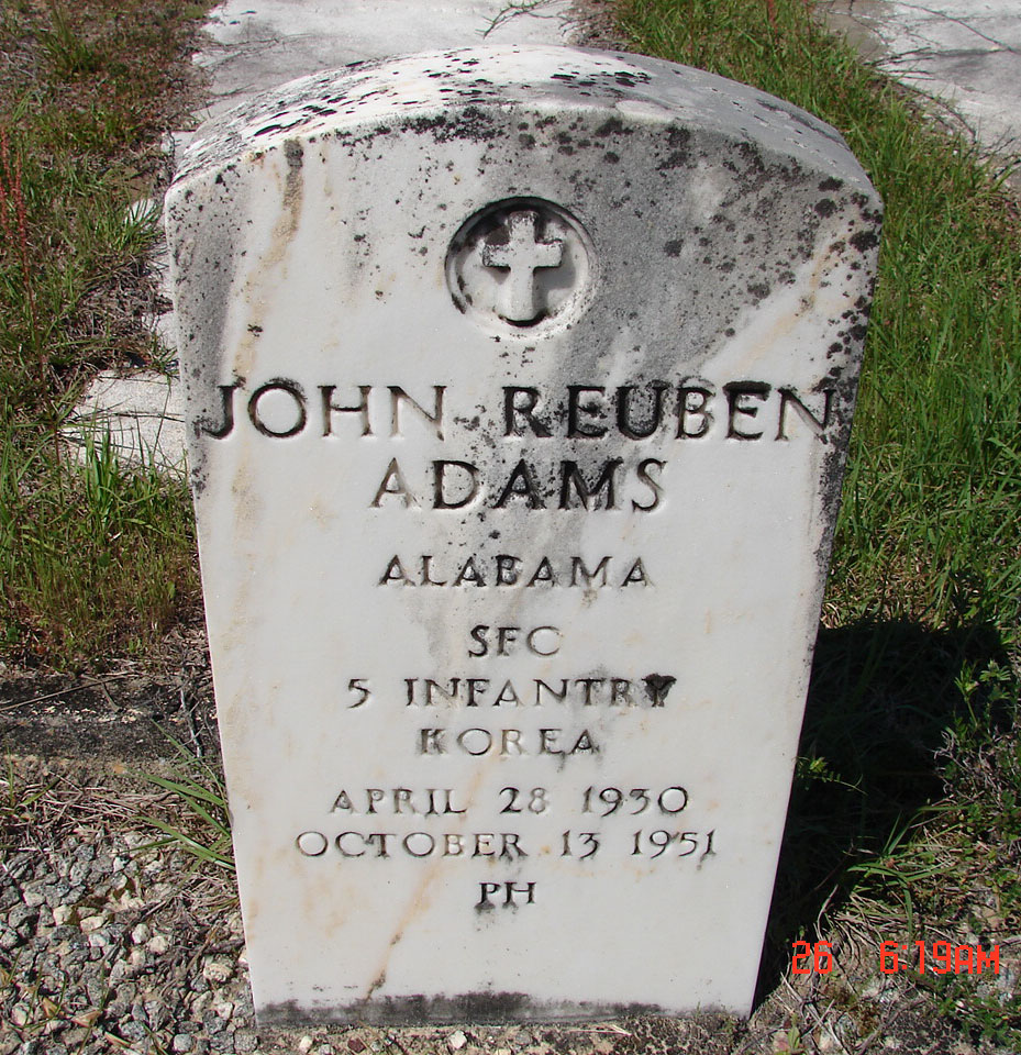 John Reuben Adams was born on April 28, 1930, in Houston, Alabama. He served in Company G, 2nd Battalion, 5th Infantry Regimental Combat Team, as a Sergeant First Class during the Korean War.