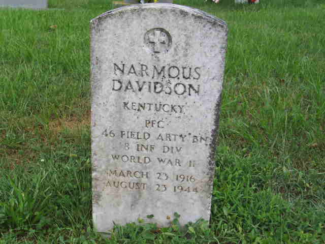 Narmous Davidson was born on March 23, 1916 in Kentucky. He served in the U.S. Army during World War II as a Private First Class in the 46th Field Artillery Battalion, 5th Infantry Division. He died on August 23, 1944 and is now buried at Hensley Holiness Church Cemetery, Clay County, Kentucky.