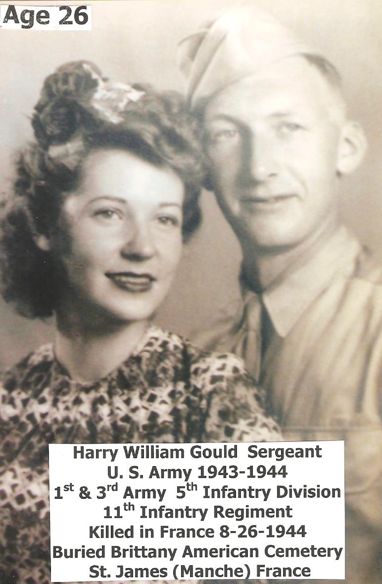 Harry W. Gould served in the U.S. Army during World War II as a Sergeant in the 11th Infantry Regiment, 5th Infantry Division. He entered service in Alaska. He died on August 26, 1944, was initially buried at Villeneuve-sur-Auvers in France and is now buried at Brittany American Cemetery, St. James, France.