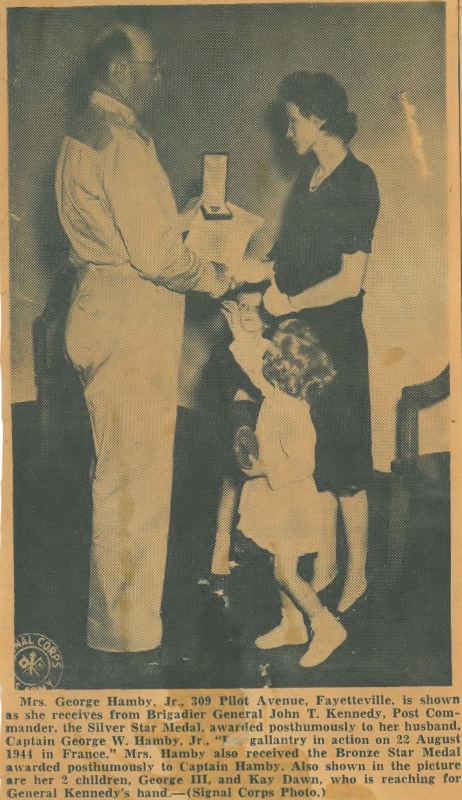 George W. Hamby, Jr. served in the U.S. Army during World War II as a Captain in the 735th Tank Battalion. He entered service in South Carolina. He died on August 24, 1944, was initially buried at Villeneuve-sur-Auvers in France and is now buried at Brittany American Cemetery, St. James, France.