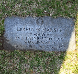 Leroy C. Harste was born on January 5, 1911. He served in the U.S. Army during World War II as a Private in the 119th Infantry Regiment, 30th Infantry Division. He died on August 29, 1944, was initially buried at Villeneuve-sur-Auvers in France and is now buried at Calvary Cemetery, Toledo, Lucas County, Ohio, USA.