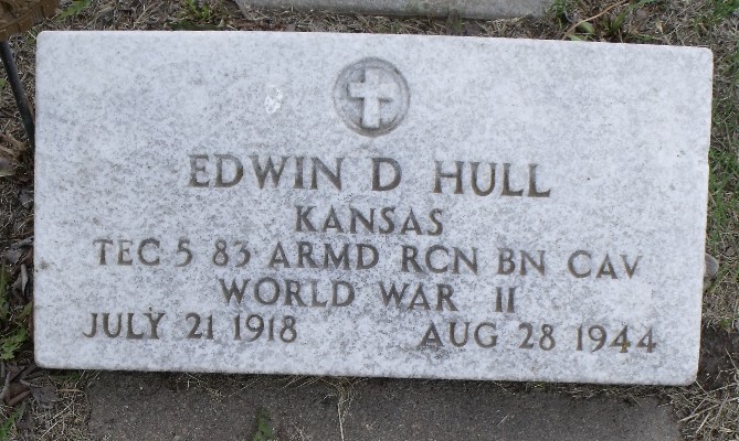 Edwin D. Hull was born on July 21, 1918. He served in the U.S. Army during World War II as a Technician Fifth Grade in the 83rd Armored Reconnaisance Battalion. He died on August 28, 1944, was initially buried at Villeneuve-sur-Auvers in France and is now buried at Prairie Lawn Cemetery, Wellington, Sumner County, Kansas, USA.