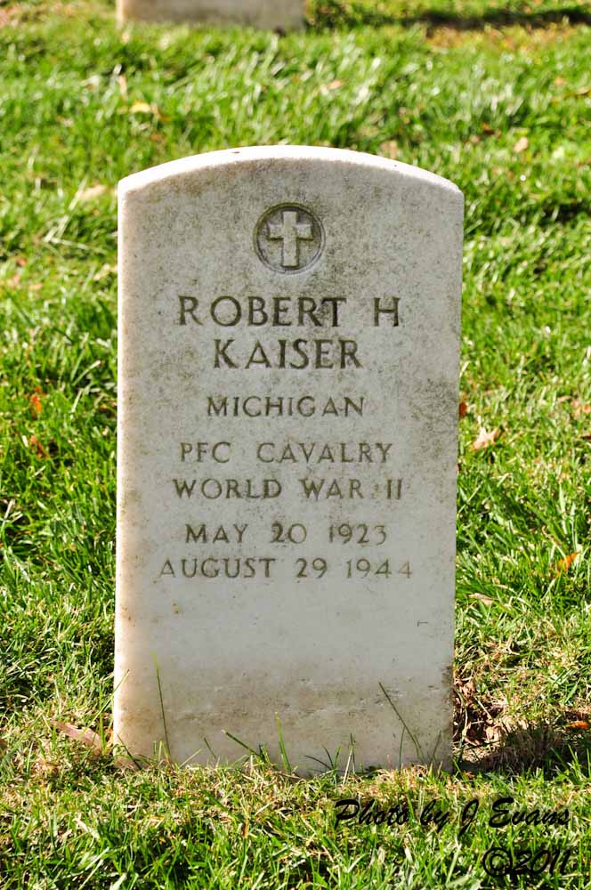 Robert H. Kaiser was born on May 20, 1923. He served in the U.S. Army during World War II as a Private First Class in the 3rd Cavalry Reconnaissance Squadron. He died on August 29, 1944, was initially buried at Villeneuve-sur-Auvers in France and is now buried at Arlington National Cemetery, Arlington, Arlington County, Virginia, USA.