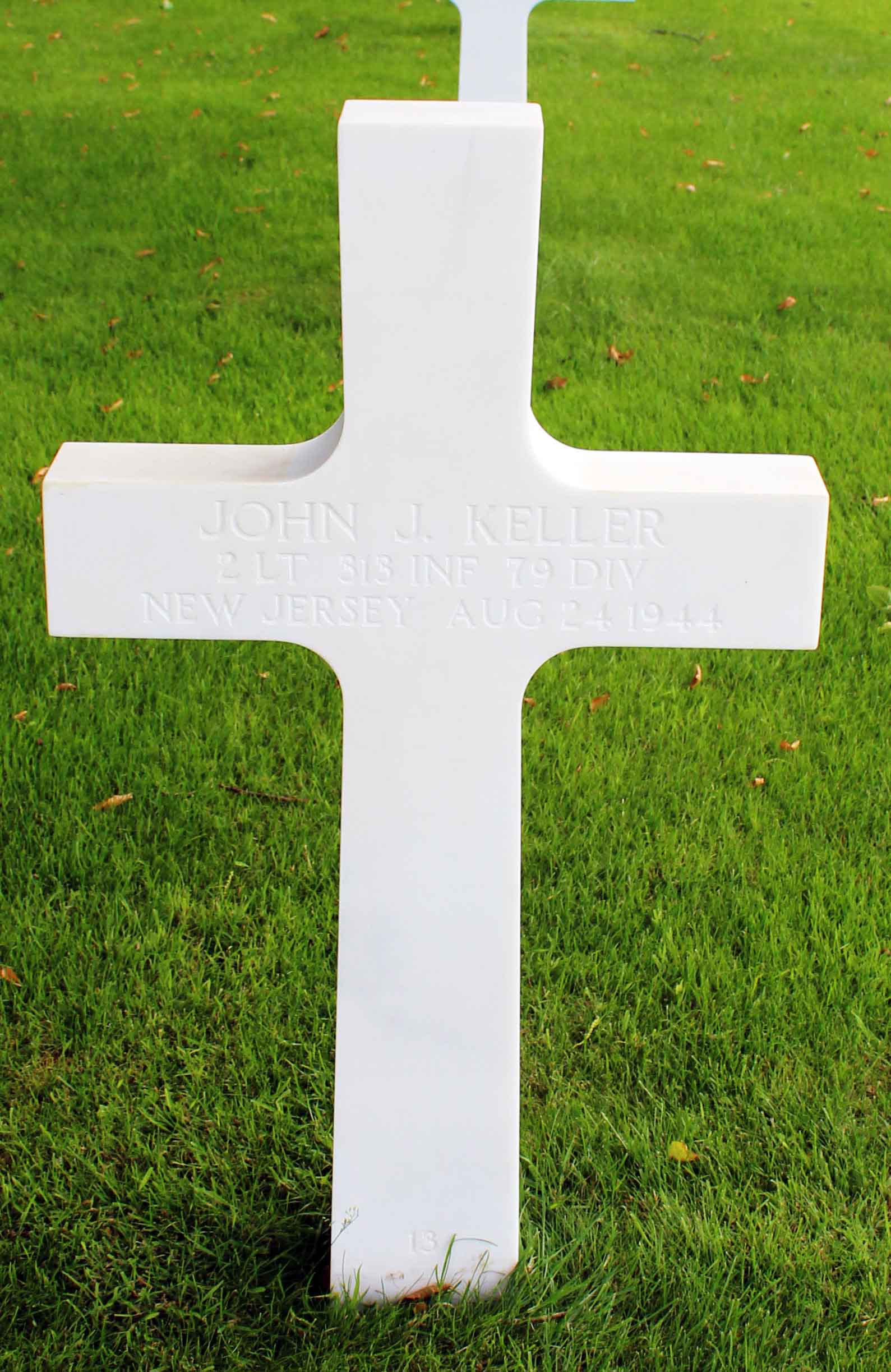 John J. Keller served in the U.S. Army during World War II as a Second Lieutenant in the 313th Infantry Regiment, 79th Infantry Division. He entered service in New Jersey. He died on August 24, 1944, was initially buried at Villeneuve-sur-Auvers in France and is now buried at Brittany American Cemetery, St. James, France.