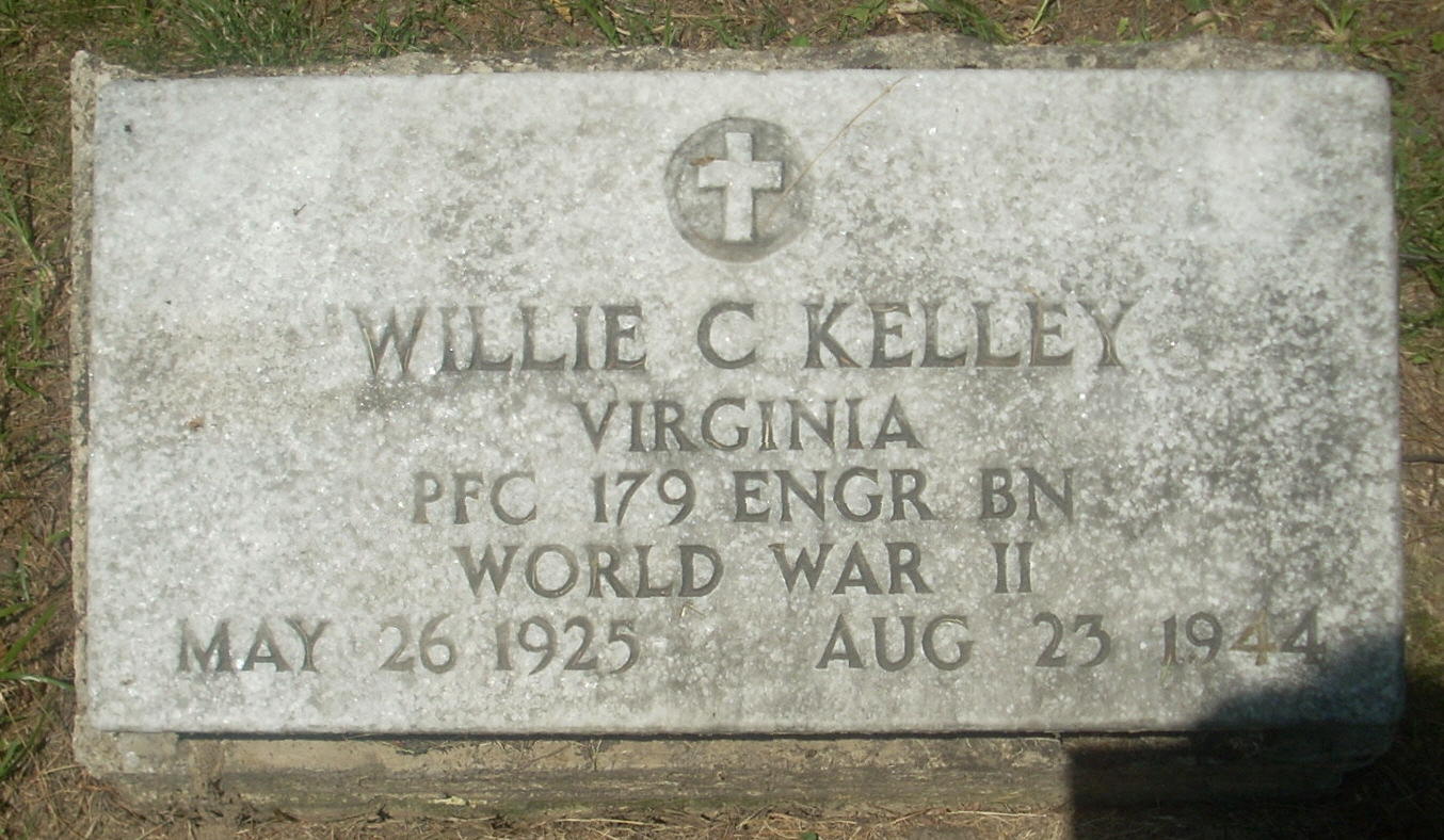 Willie C. Kelley was born on May 26, 1925. When Willie Crockett Kelly was born on May 26, 1925, in Kentucky, his father, Silas, was 26 and his mother, Mary, was 21. He had two brothers and three sisters. He served in the U.S. Army during World War II as a Private First Class in the 179th Engineers Combat Battalion. He died on August 23, 1944, was initially buried at Villeneuve-sur-Auvers in France and is now buried at Swindall Cemetery, Dickenson County, Virginia, USA.