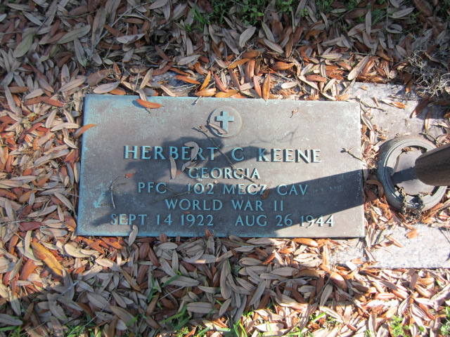 Herbert C. Keene was born on September 14, 1922. He served in the U.S. Army during World War II as a Private First Class in the 102nd Cavalry Reconnaissance Squadron (Mecz). He entered service in Georgia. He died on August 26, 1944, was initially buried at Villeneuve-sur-Auvers in France and is now buried at Hillcrest Abbey East Cemetery, Savannah, Chatham County, Georgia, USA.