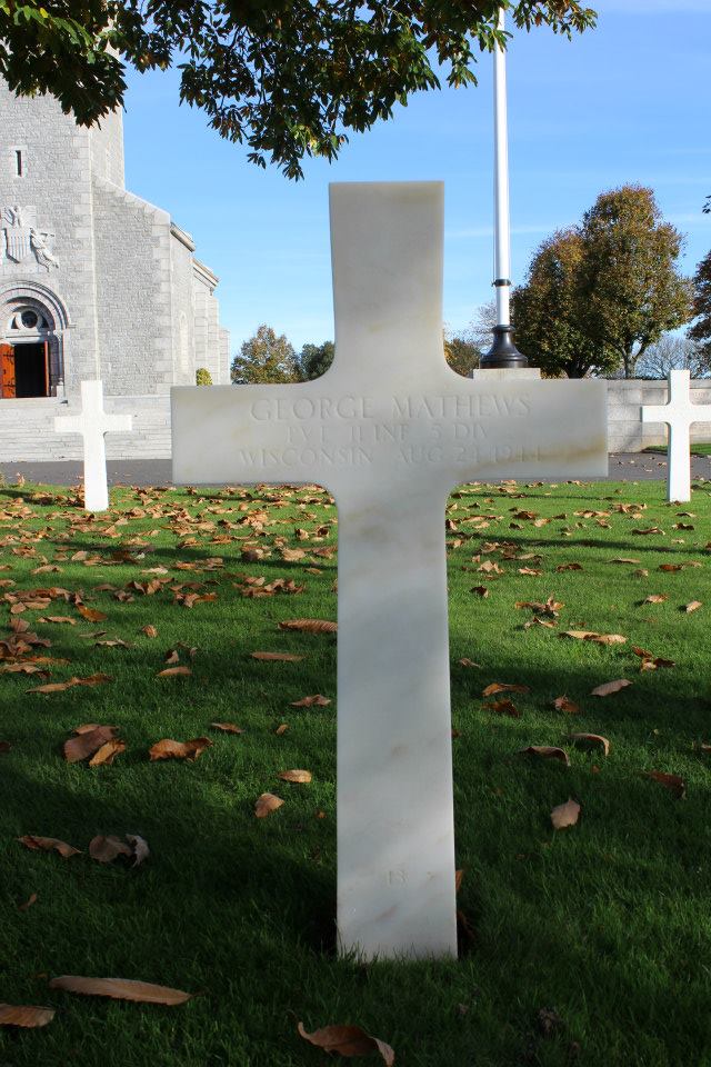 George Mathews was born on August 1908 in Wisconsin, USA. He served in the U.S. Army during World War II as a Private in the 11th Infantry Regiment, 5th Infantry Division. He entered service in Wisconsin. He died on August 24, 1944, was initially buried at Villeneuve-sur-Auvers in France and is now buried at Brittany American Cemetery, St. James, France.
