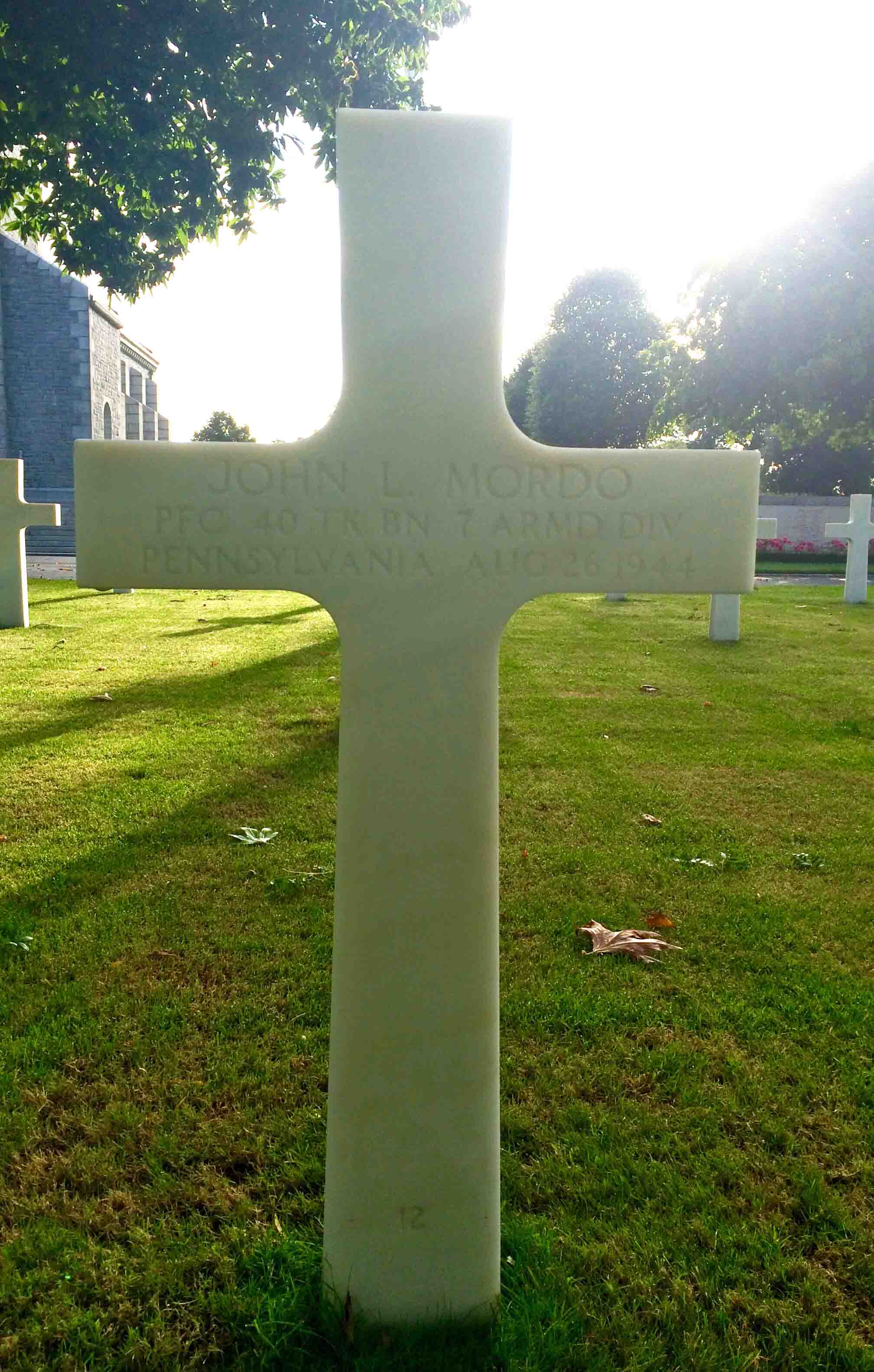 John Lawrence Mordo was born on March 10, 1920 in Mayfield, Lackawanna County, Pennsylvania, USA. He served in the U.S. Army during World War II as a Private First Class in the 40th Tank Battalion, 7th Armored Division. He entered service in Pennsylvania. He died on August 26, 1944, was initially buried at Villeneuve-sur-Auvers in France and is now buried at Brittany American Cemetery, St. James, France.