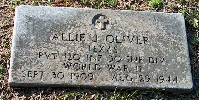 Allie Jennings Oliver was born on September 30, 1909. He served in the U.S. Army during World War II as a Private in the 120th Infantry Regiment, 30th Infantry Division. He entered service in Texas. He died on August 29, 1944, was initially buried at Villeneuve-sur-Auvers in France and is now buried at Fairview Cemetery, Center, Shelby County, Texas, USA.
