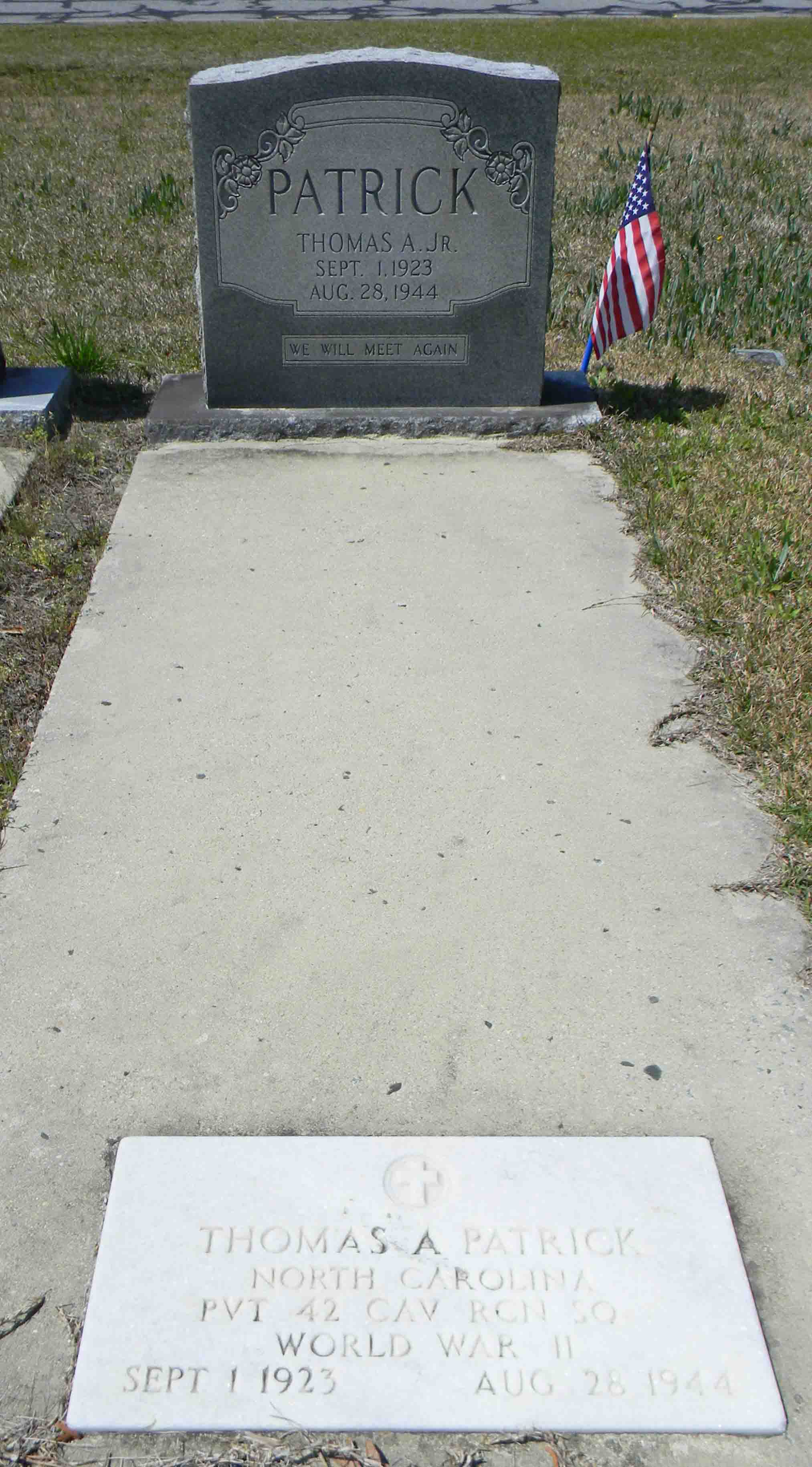 Thomas A. Patrick, Jr. was born on September 1, 1923. He served in the U.S. Army during World War II as a Private in the 42nd Cavalry Reconnaissance Squadron. He entered service in North Carolina. He died on August 28, 1944, was initially buried at Villeneuve-sur-Auvers in France and is now buried at Saint David's Episcopal Church Cemetery, Creswell, Washington County, North Carolina, USA.