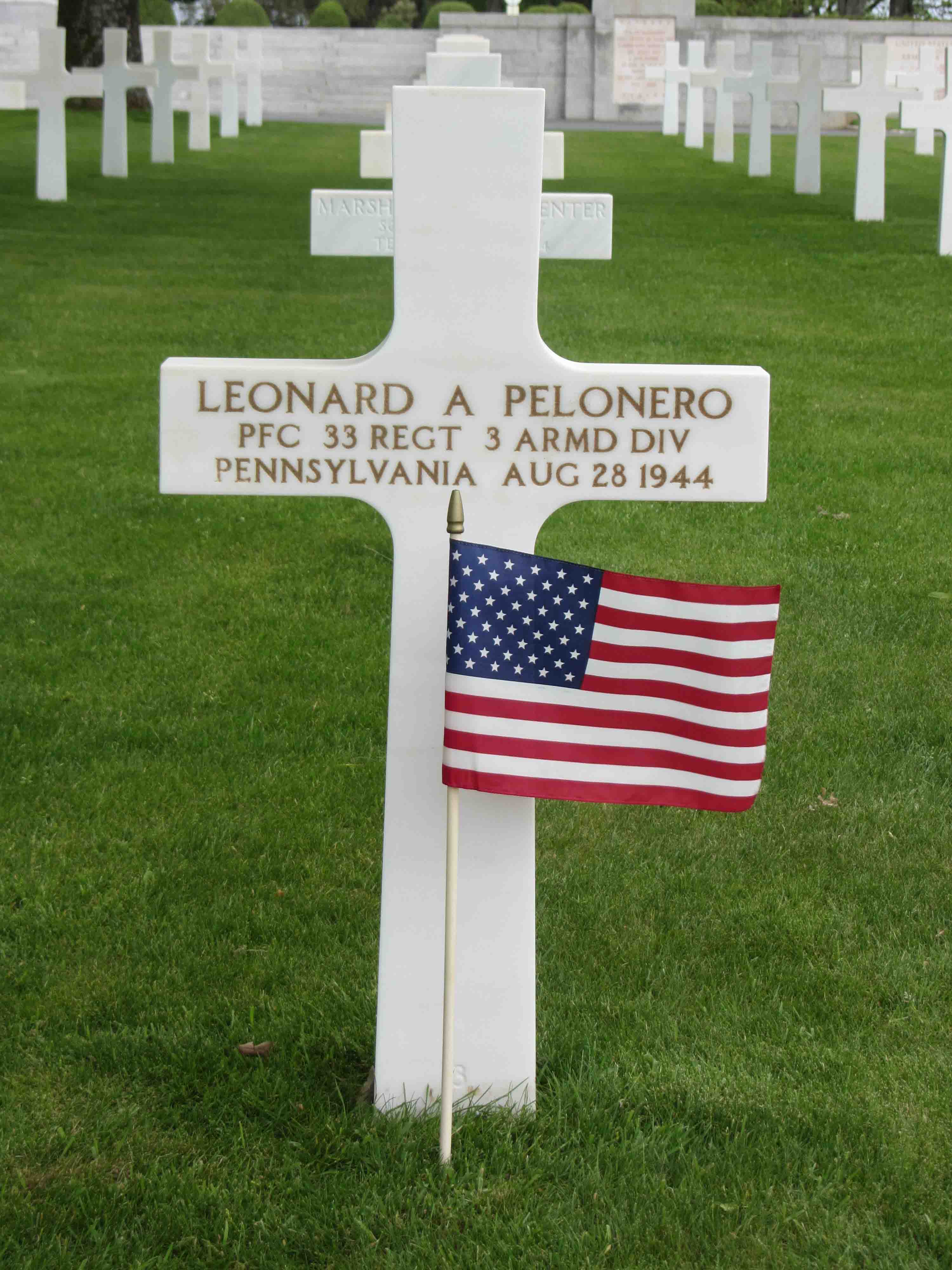 Leonard A. Pelonero was born on October 16, 1919 in Pennsylvania, USA. He served in the U.S. Army during World War II as a Private First Class in the 33rd Armored Regiment, 3rd Armored Division. He entered service in Pennsylvania. He died on August 28, 1944, was initially buried at Villeneuve-sur-Auvers in France and is now buried at Brittany American Cemetery, St. James, France.