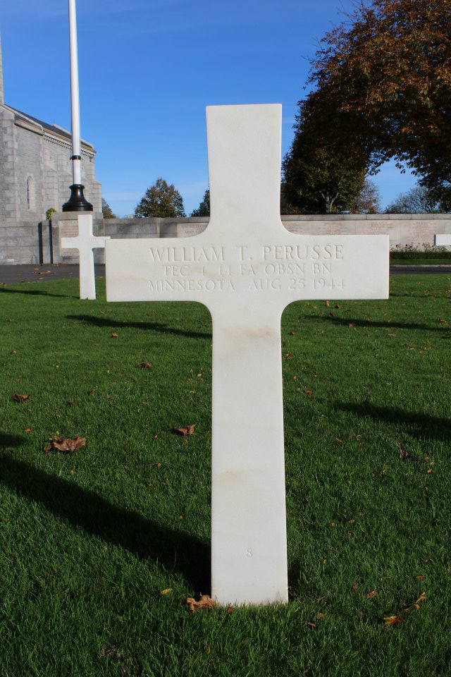 William T. Perusse served in the U.S. Army during World War II as a Technician Fourth Grade in the 14th Field Artillery Observation Battalion. He entered service in Minnesota. He died on August 25, 1944, was initially buried at Villeneuve-sur-Auvers in France and is now buried at Brittany American Cemetery, St. James, France.