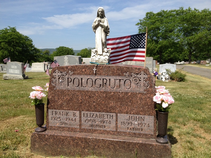 When Frank B Pologruto was born on February 26, 1925, his father, Giovanni, was 25 and his mother, Elizabeth, was 16. He had one brother and one sister. He served in the U.S. Army during World War II as a Private First Class in the 179th Engineers Combat Battalion. He entered service in New Jersey. He died on August 23, 1944, was initially buried at Villeneuve-sur-Auvers in France and is now buried at Saint Philip and Saint James Cemetery, Greenwich Township, Warren County, New Jersey, USA.
